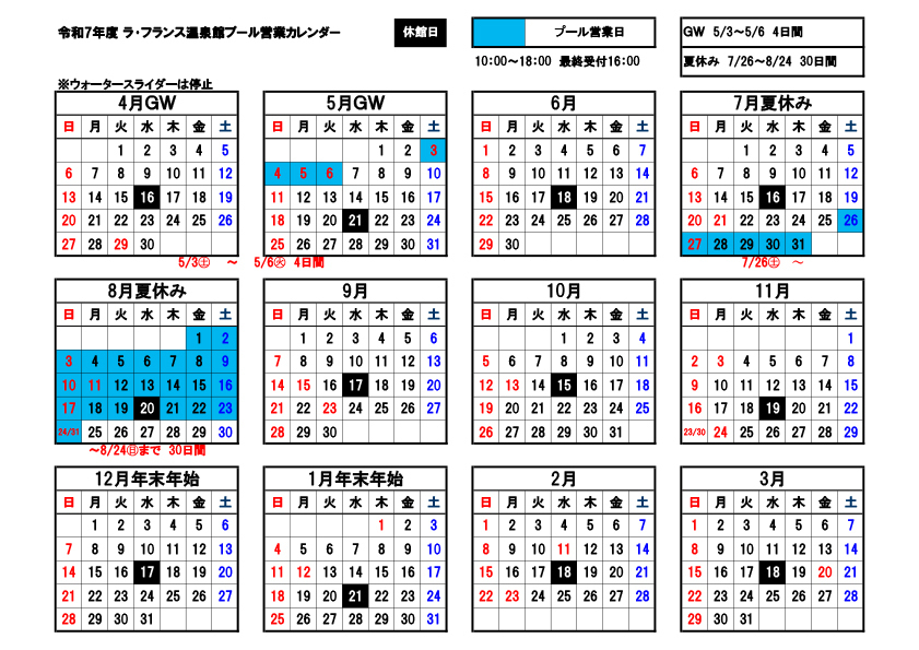 令和7年度 ラ・フランス温泉館プール営業カレンダー・料金表