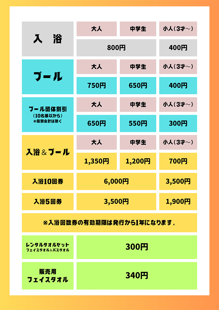 ラ・フランス温泉館料金表(2025年4月1日改訂)